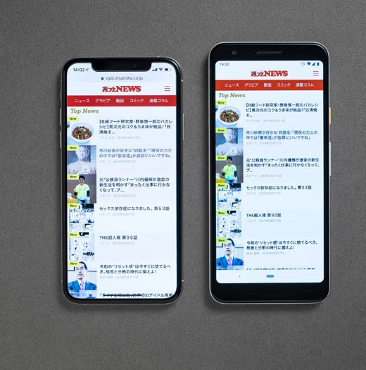 ディスプレイは5.6インチでiPhone XS(左)より若干小型。しかし、週プレNEWSの表示領域はXSとほぼ同等で、ノッチがなく見やすい。