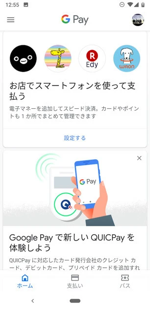 電子マネーアプリ『Google Pay』に対応し、SuicaやQUICPayでのタッチの支払いがOK。各種ポイントカードも一元化できる神アプリ!