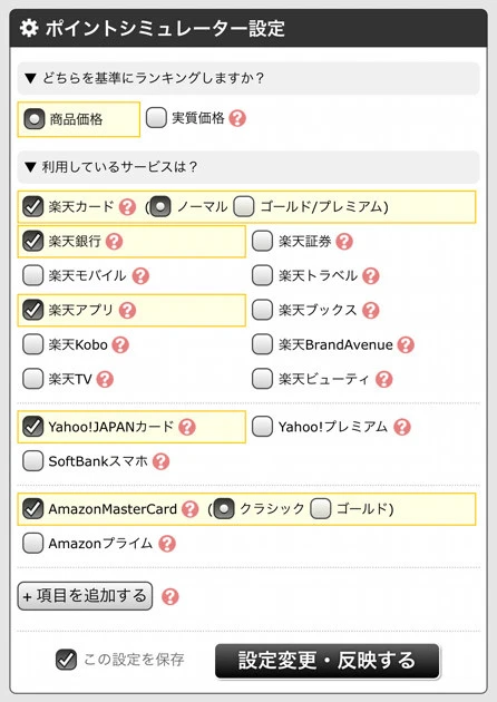 発生するポイントが考慮された実質価格の確認は、設定画面から自分が所有するクレカや利用しているサービスをチェックするだけ!