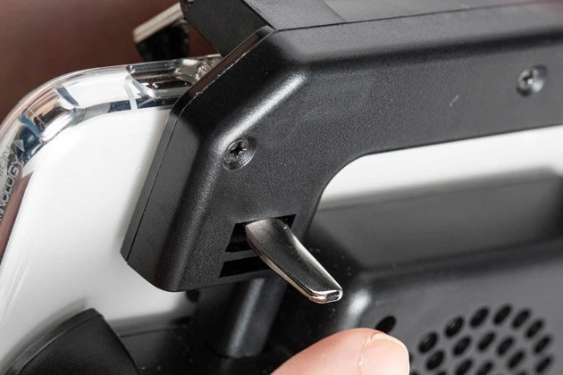 背面のトリガーボタンと連動するディスプレイ側のボタンは、ゲーム画面の表示を邪魔しない小型サイズだ。