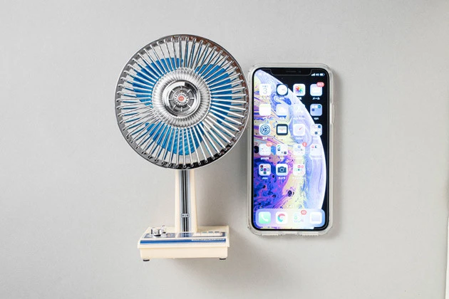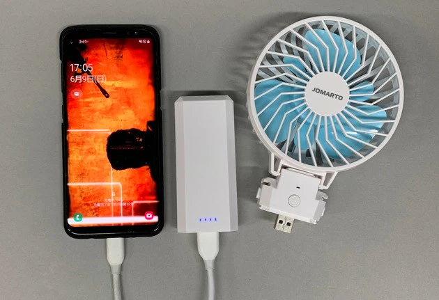 iPhone 8なら約2回もフル充電できるモバイルバッテリーを搭載した携帯扇風機。スマホへの充電時は写真右のようにグリップ部分を分離して行なう。これはガチで便利!