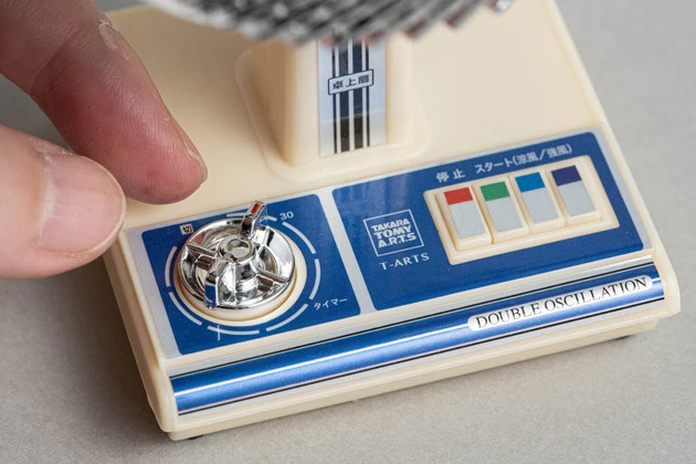 ビジュアル的には、昭和の家庭にあった扇風機そのもの! 全高約17cmの小型サイズですが、実は操作ボタンやダイヤルも機能し、首振り機能もアリという十分なスペックを誇る一台。