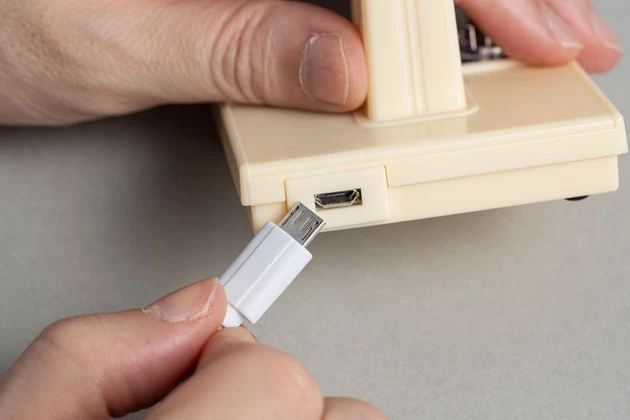電源はMicroUSBを使用。スマホ用の各種充電器やモバイルバッテリーから給電することが可能。本体にはMicroUSBケーブルが付属する。