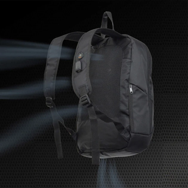 夏場は激ムレ状態で、においのもとにもなるリュックの裏側! 本体の背面部分にファンを内蔵し、背中を冷却して解消。冬場には腰部のヒーター機能も使える、オールシーズン対応!