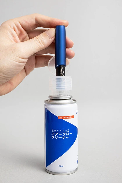 こちらもホルダーを本体へ差して使用するタイプ。IQOSの内部へエアーを噴射してヤニを吹き飛ばすので、ブレードを傷つける心配ナシ。清掃の仕上げに一吹きするのも有効ですよ!