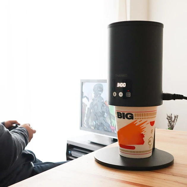 フタを剥がしたカップ緬をセットすれば、お湯の沸騰から注入まで全自動でカップ麺が完成する、ズボラさん専用マシン。コーヒーやカップスープにも活用できますよ!
