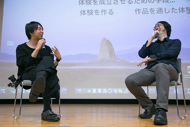 筑波大学で講義をする落合陽一(右)と北田能士