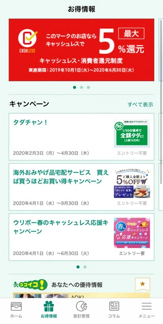 どの会社のアプリも、利用した金額、利用可能金額、支払い方法の変更、そして超重要な引き落とし日などをひと目でチェックできる便利仕様。そして、見逃せないのが、お得なキャンペーン情報だ。