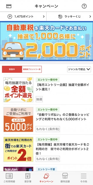 楽天カードでの支払い履歴、楽天スーパーポイントなどをまとめて管理OK。楽天は、とにかくキャンペーンが豊富なので、それらをチェックして即エントリーできるのも便利ですよ!