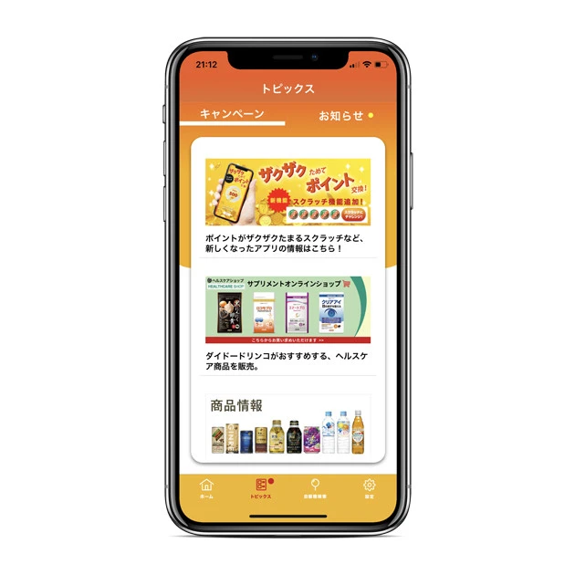 ダイドーの自販機に対応。自販機での購入時や各種ゲームで独自ポイントを獲得でき、それらを楽天やnanacoなどのポイントへの交換が可能だ。