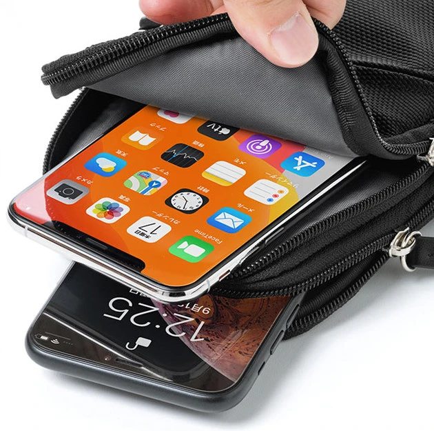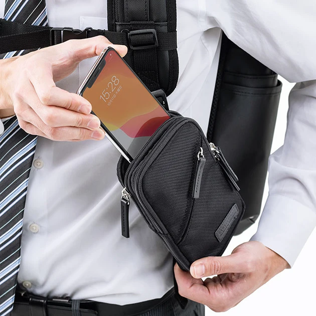リュックのストラップ部分に装着でき、スマホの出し入れがスムーズなポーチ。各種ケーブルやモバイルバッテリーも収納できますよ!