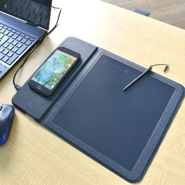 iPhoneやAir Podsのワイヤレス充電が可能。さらにパッド部分は電子メモ機能を搭載し、付属ペンでメモ書きができますよ!