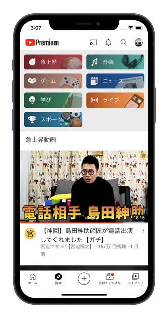 iOS、Android共にYouTube公式アプリで使える機能が【探索】だ。下部メニュー【探索】から表示され、【急上昇】【ニュース】など、現在注目の動画を即表示できる、検索はかどり機能ですよ!