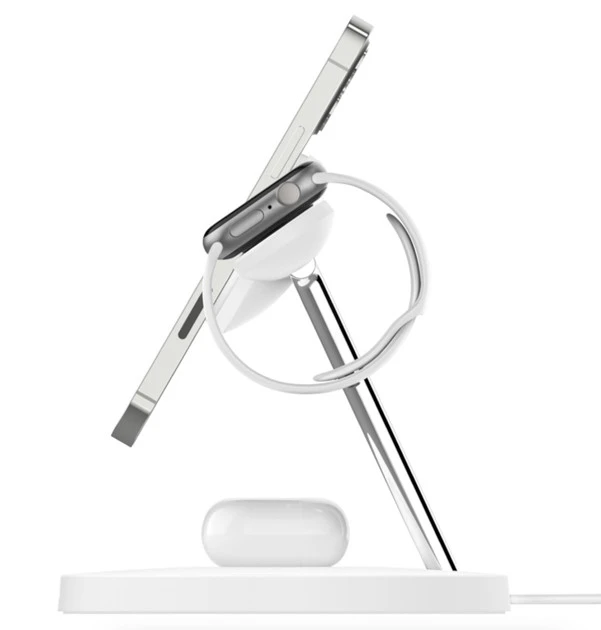iPhone12シリーズ、Apple Watch、AirPods Proを同時にワイヤレス充電できるアイテム。iPhone12シリーズはスタンドに貼りつけて充電でき、ベッドサイドでの動画視聴にもオススメ。