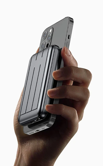 ワイヤレス充電対応で、端末に貼りつけ可能なモバイルバッテリー。重量130gで、iPhone12を3回フル充電できる10000mAhの大容量!
