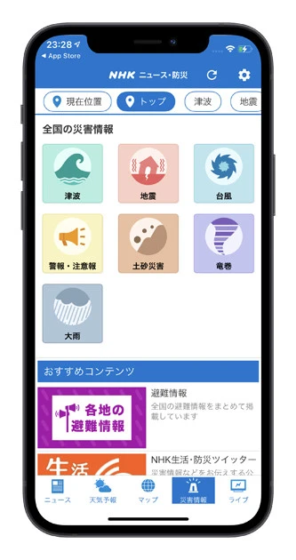 災害情報をスマホへ速報通知。関連するニュース、現場のライブカメラなどを動画で即確認できるのはNHKアプリならでは!