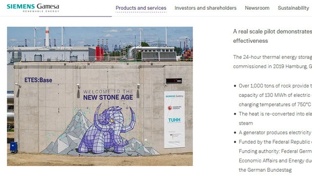 シーメンス・ガメサ・リニューアブル・エナジー社が開発した岩石を熱してエネルギーをためる蓄電施設「エレクトリック・サーマル・エナジー・ストレージ(ETES)」の外観。壁に描かれたマンモスの絵と「新しい石器時代へようこそ」の文字が目を引く(同社HPより)