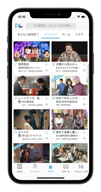 ドラマ、バラエティなど豊富にラインナップ。見たい番組を「マイリスト」に登録しておけばスマホに通知され、見逃し防止!