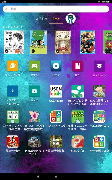 キッズが雑に扱うことを考慮して、2年間の製品保証が付帯。各種知育アプリ、絵本や歴史マンガ、クイズなど、数千点のキッズ用コンテンツがそろった「Amazon Kids+」(年額9800円)が1年間使い放題のスペシャルモデル。