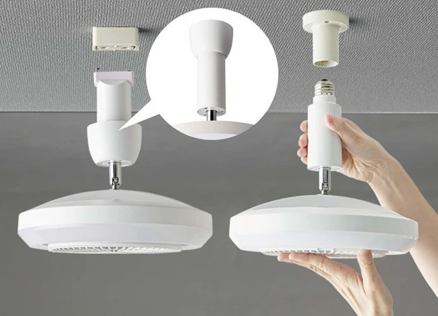 天井に設置するLEDライトに、サーキュレーター機能をプラス。「ねじ込み式」(中右)と「引掛けモデル」(中左)の2タイプが販売され、どんなお部屋にも工事ナシで設置可能。