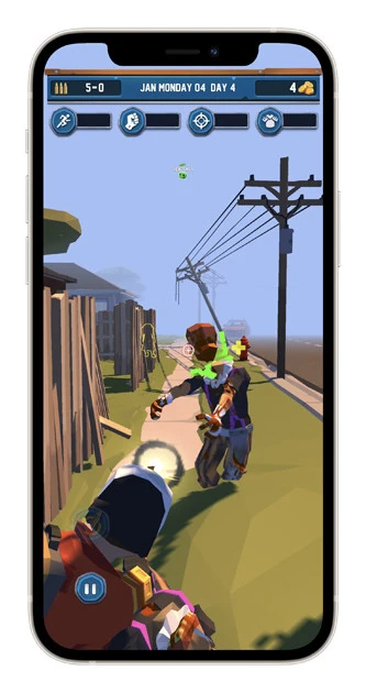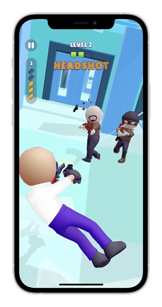 ステージごとにオート射撃とオート移動が切り替わるガンアクション。バトロワ風のゲーム画面だが、実は片手で操作できる超簡単仕様。バトロワの操作感覚を覚えるのにもオススメ!