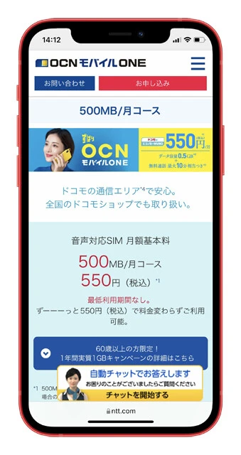 プラン名:500MB/月コース ギガ容量:500MB 料金:月550円