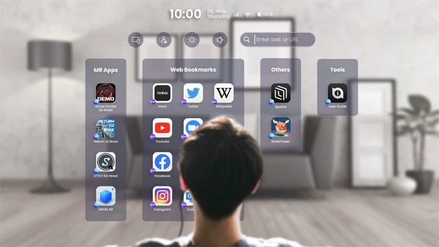 Androidスマホに対応した重量約76gのARグラス。サングラスタイプのレンズ内には約130インチのバーチャルスクリーンを投影することが可能。写真のようにスマホのOSの各種操作、そして動画視聴やゲームプレイにまで対応する次世代アイテム!