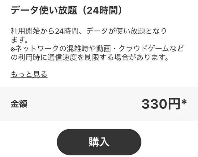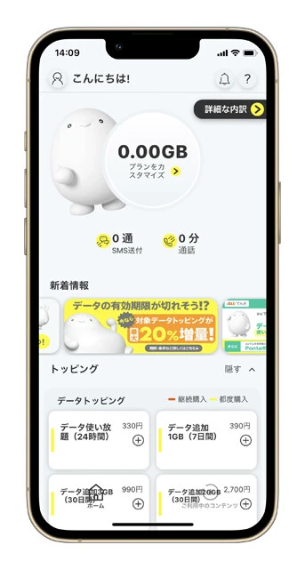 【1GB(7日間)390円】【3GB(30日間)990円】【データ使い放題(24時間)330円】など豊富なトッピングを用意。トッピングは専用アプリから行なえ、即時に適用される。