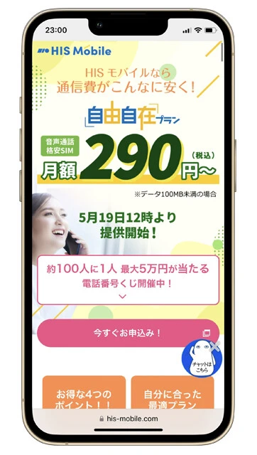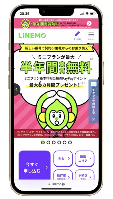 ギガ容量3GBで月額990円だけでなく、大容量の20GBで2728円のプランも用意。オンラインから即加入でき、【半年間実質無料】や【MNPで1万円相当のPayPayポイントをプレゼント】など強力キャンペーンを連発中!