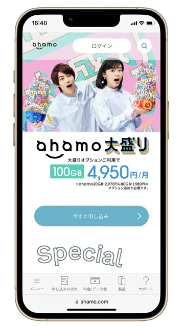 これまでのギガ容量20GBで月額2970円のプランに、【80GB/月1980円】の大盛りオプションの提供を開始。「ディズニープラス」や「YouTube Premium」などの割引・無料特典もあり、動画系サブスクをお得活用できるのも特徴。