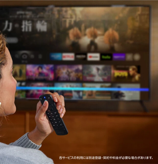 2017年発売のFire TV Stick(第2世代)以降のモデルに対応する多機能リモコン。リモコン本体にAlexaを搭載して、こちらも音声での操作が可能。ボタン部分はバックライトを搭載し、暗闇では本体を持ち上げるだけで自動点灯する。