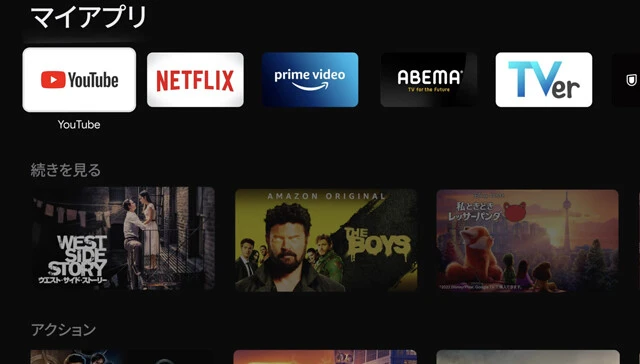 こちらも各種動画サブスクやYouTubeをテレビで視聴可能。もちろんiOS、iPad OSで視聴中の動画をそのままテレビへ出力できる。画質は4KハイフレームレートHDRに対応して常になめらか高画質、音声はドルビーアトモスに対応した3Dオーディオという、画質・音質スペックが圧倒的。3Dゲームもサクサク動くのが特徴です!