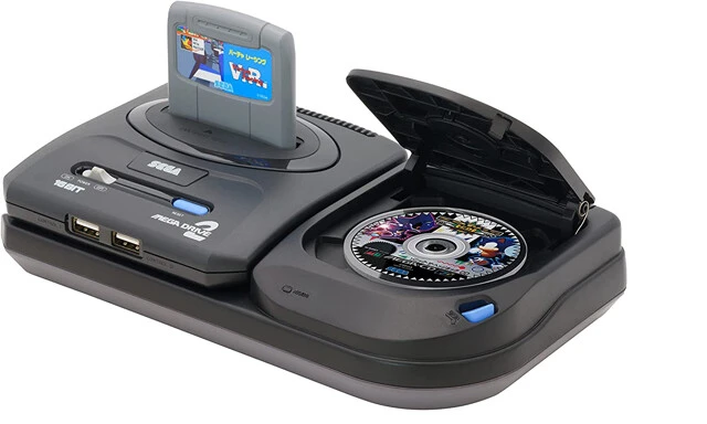 1993年にメガドライブ2と同時発売されたメガCD2をミニチュア化。写真のようにメガドライブミニ2とドッキングできるデコレーションキットで、『バーチャレーシング』と『ソニック・ザ・ヘッジホッグCD』のミニチュアソフトも同梱。