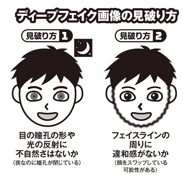 しかし、最近はこうしたチェックポイントもわかりにくくなっているので、「目の瞳孔(どうこう)の形や光の反射が不自然ではないか」(夜なのに瞳孔が小さくなっていたりする)などを見るようになりました。