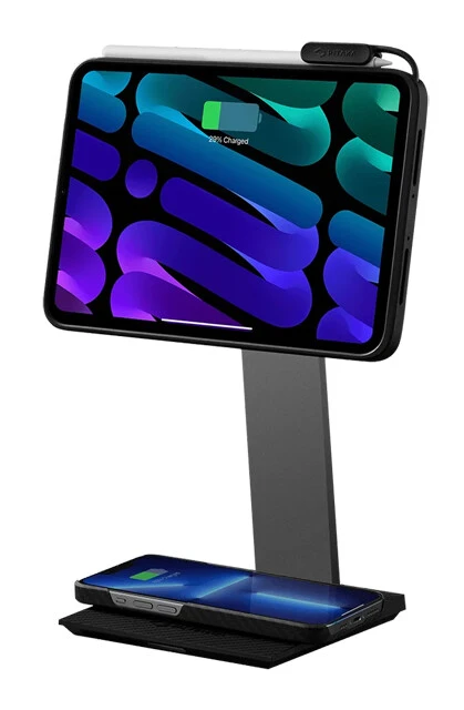 こちらはPITAKA MagEZ Caseの専用スタンド。iPadシリーズを装着して回転・角度調整が自由自在に行なえ、デスクトップパソコンの外部モニターのように活用できるのがポイント。iPadシリーズへのマグネット式急速充電はもちろん、台座部分はiPhoneやAir Podsのワイヤレス充電にも対応!