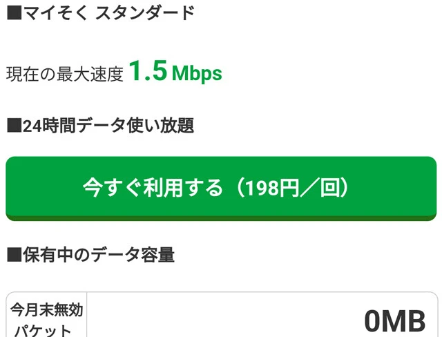 プラン名:マイそくスーパーライト/ギガ容量:無制限(通信速度:最大32kbps)/月額250円/24時間データ使い放題:一回198円