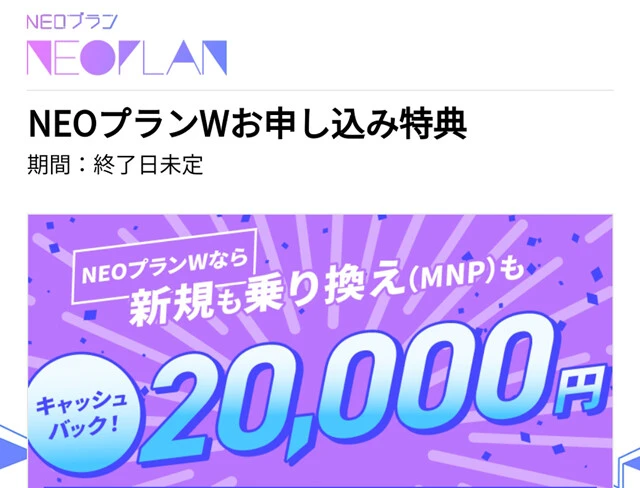 プラン名:NEOプランW/ギガ容量:40GB/月額3980円