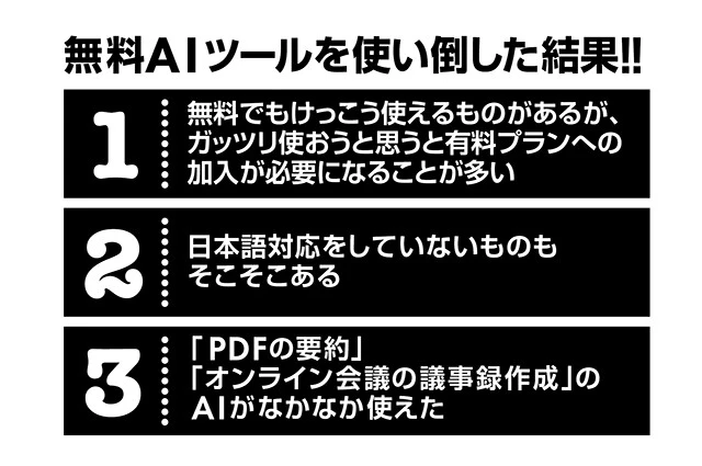 問いかけると自然な言葉で回答を返してくれる対話型AI「ChatGPT」が話題を呼んで、はや半年。後を追うように、実用的な無料AIツールが続々登場している。実際どこまで使えるのか!?