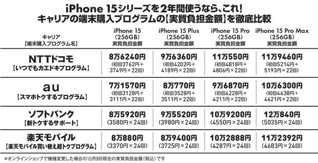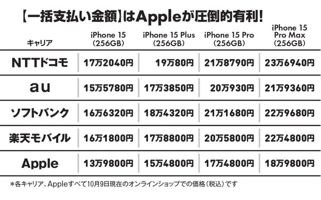 ――ところで、Apple直販でiPhone 15シリーズを購入するのはどうですか? そもそも一括支払いの値段がお安いですよね。