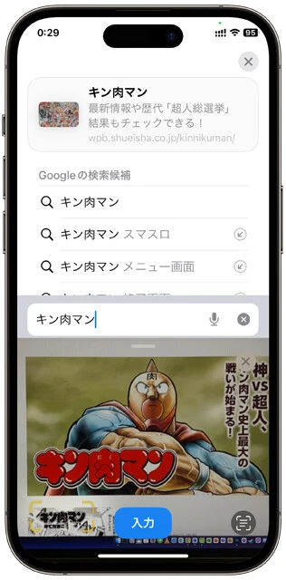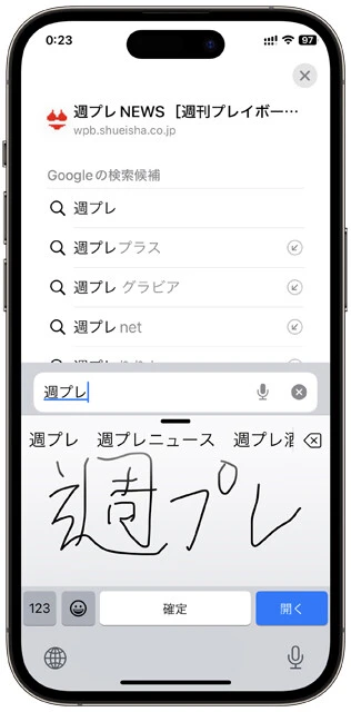 【設定→一般→キーボード→日本語】を選択して【手書き】にチェックすれば、文字入力で手書きが選択可能に! 手書きの途中から【入力候補】が表示され、これは難読漢字の入力にも最適な機能。そして、画像から文字を読み取る機能も精度がアップ。例えば、『キン肉マン』のロゴ部分を認識してそのままキン肉マン関連の検索も可能だ。