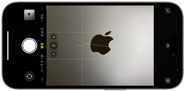 撮影時のiPhoneの傾きを視覚的に表示する機能が水平器だ。画面中央に白いラインが表示され、本体が水平に保たれた場合に黄色ラインとなる。【設定→カメラ→水平】から水平器のオンオフが可能。