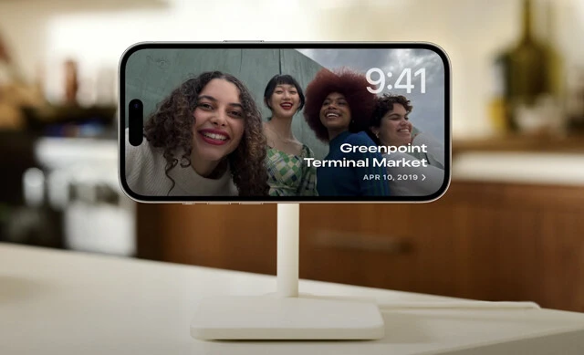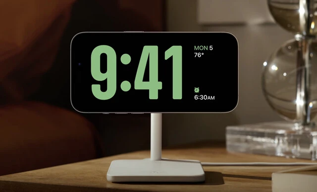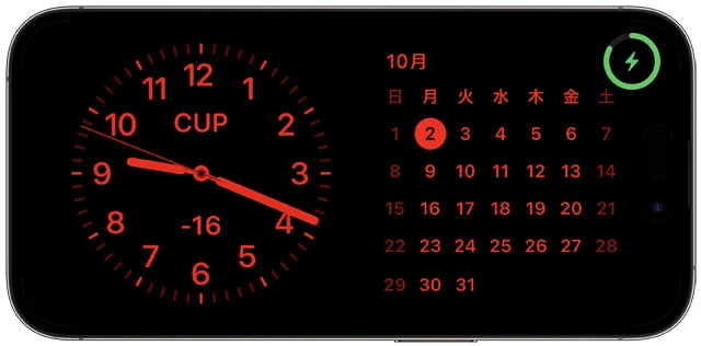 iPhoneを横向きで充電中に利用できる機能「スタンバイ」。この状態でディスプレーにウィジェット、時計、カレンダーの表示が可能。もちろん、音声アシスタントのSiriも利用可能。暗闇ではディスプレーは輝度を抑えた表示になり、声でウィジェットの操作を行なうことで、寝室のスマートディスプレーとしても大活用できますよ!