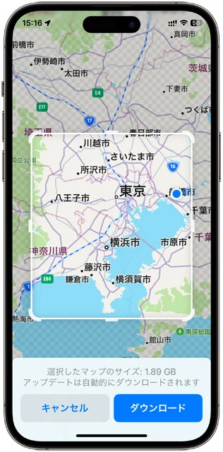 「オフラインマップ」は、マップアプリの地図データをダウンロードすることで、データ通信不可の状態でもナビなどを利用できる便利機能だ。ただし、首都圏のデータをダウンロードした場合、1.89GBのストレージ容量を消費するので、ストレージ管理には要注意です!