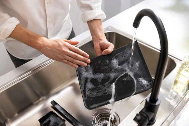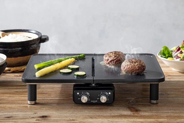 本体は左右2枚のプレートで構成され、ひとり飯なら1枚、人数が増えてもプレート2枚の大サイズで調理できるのがポイント。プレートはそれぞれ個別に火力調節ができ、肉と焼きそばを分けて焼くこともOK。調理後はプレート部分だけ取り外して丸洗いできるので、フライパン感覚で日常使いできますよ!