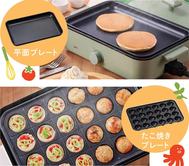 本体サイズは縦237㎜×横371㎜×高さ134㎜、テーブルの上に置きっぱなしにしても邪魔にならないコンパクトなホットプレート。一般的な平面タイプのプレートと、たこ焼きプレートが付属し、プレートはそれぞれ丸洗いすることが可能。ギョーザやチャーハンなど各種冷凍食品の調理用にもオススメです!