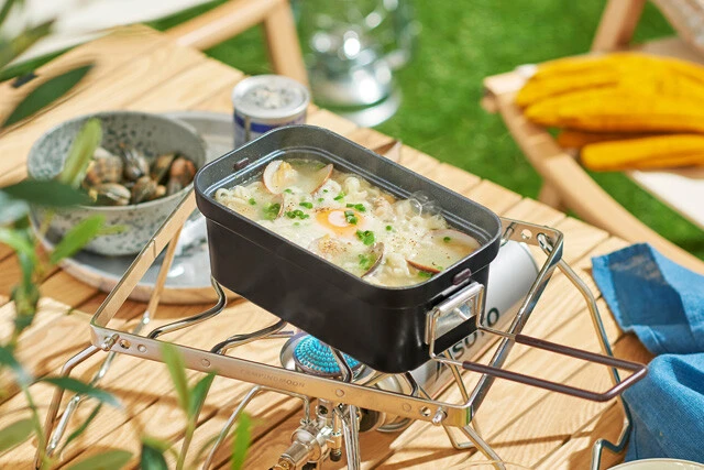 焼く、煮る、蒸す、さらには炊飯もできる調理アイテムとして人気のメスティン。こちらは専用の加熱台が付属するので、別途にコンロなどは必要なし。メスティン部分は最大で1.5合まで炊飯でき、ガスコンロでの加熱にも対応!