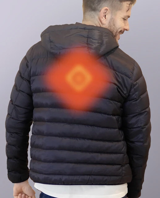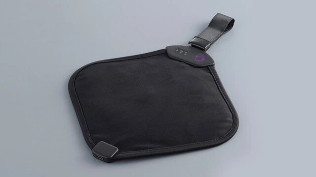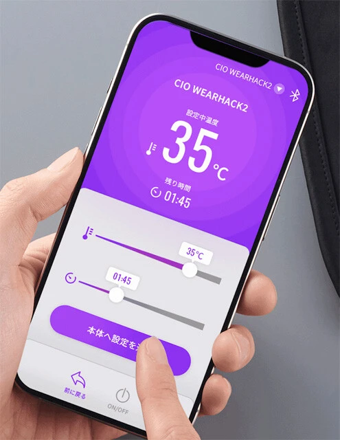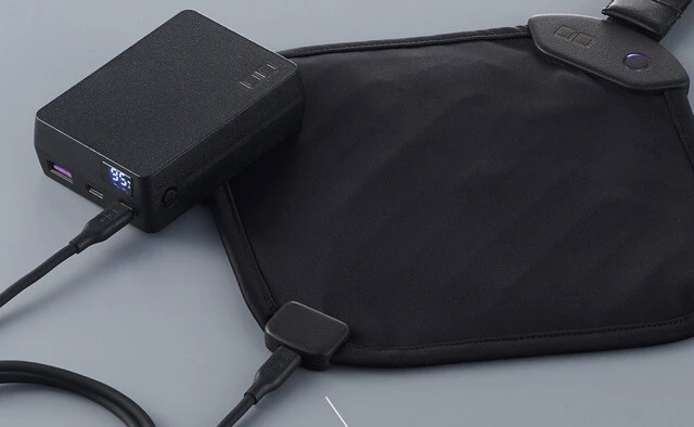 約200㎜×200㎜で本体重量約90gのヒーターユニット。こちらをフリースやライトダウンジャケットの裏面にあるハンガーループに装着することで、電熱ウエア化してしまう超画期的アイテム。35℃から60℃までの温度設定が可能で、スマホアプリからの操作にも対応。電源は別売りのモバイルバッテリーを利用し、5000mAhのモバイルバッテリーなら最大で3時間稼動。釣りやスポーツ観戦などに活用したいアイテムです!