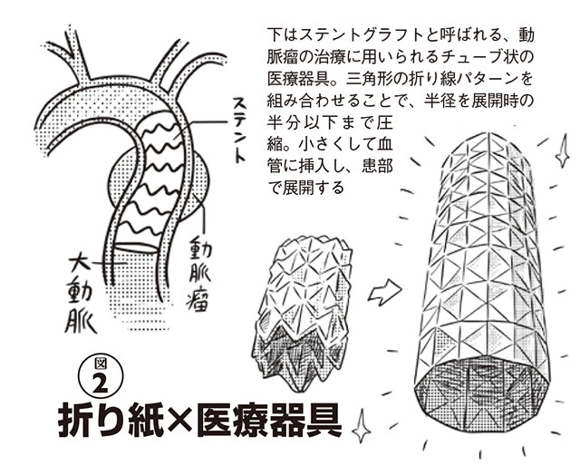 小さく折り畳んで血管内を移動させ、そして患部で血管に合わせて円柱状に展開させて血管を補強するのだが、そこに折り紙工学の知見が生きるのだ。