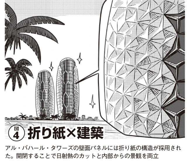 折り紙工学の守備範囲はまだある。建築に目を向けて、アラブ首長国連邦の首都・アブダビにある「アル・バハール・タワーズ」を見てみよう。