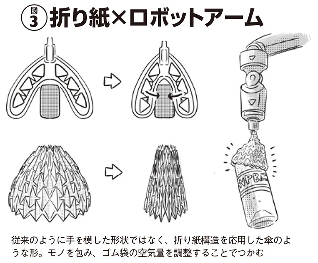 気密性の高いゴム袋の中に折り畳み可能なシリコンゴムの骨組みが構築された釣り鐘状の構造の装置なのだが、イラストを見ていただいたほうが早いだろう。骨組みに施された折り紙構造と、袋内の空気量の調整によって、丸いものから四角いものまでどんな形にも対応できるようになった。